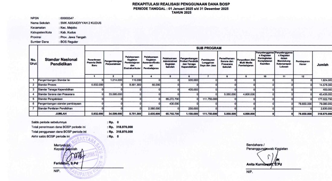 Laporan Rekapitulasi Realisasi Penggunaan Dana BOS Kinerja Tahun 2025