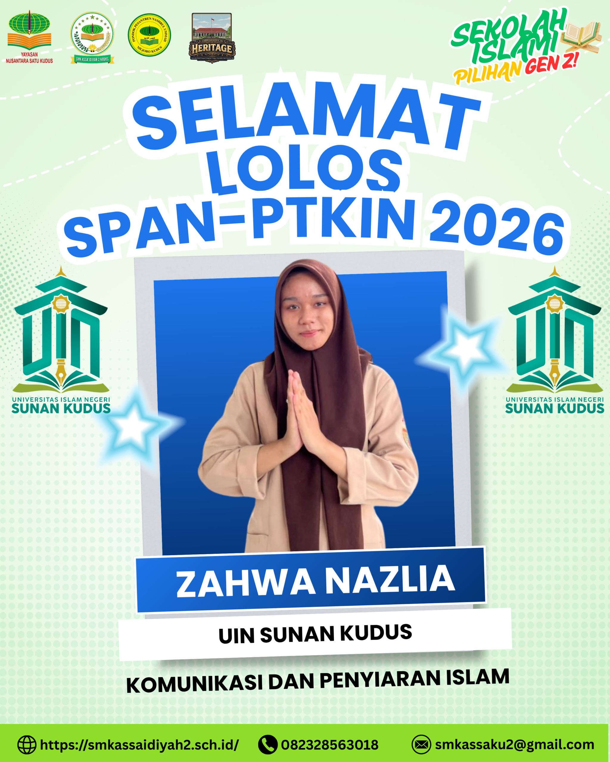 Selamat kepada SABRINA NOVIA yang telah LOLOS SPAN-PTKIN 2026 di UIN Sunan Kudus jurusan Perbankan Syariah. 📚🌟